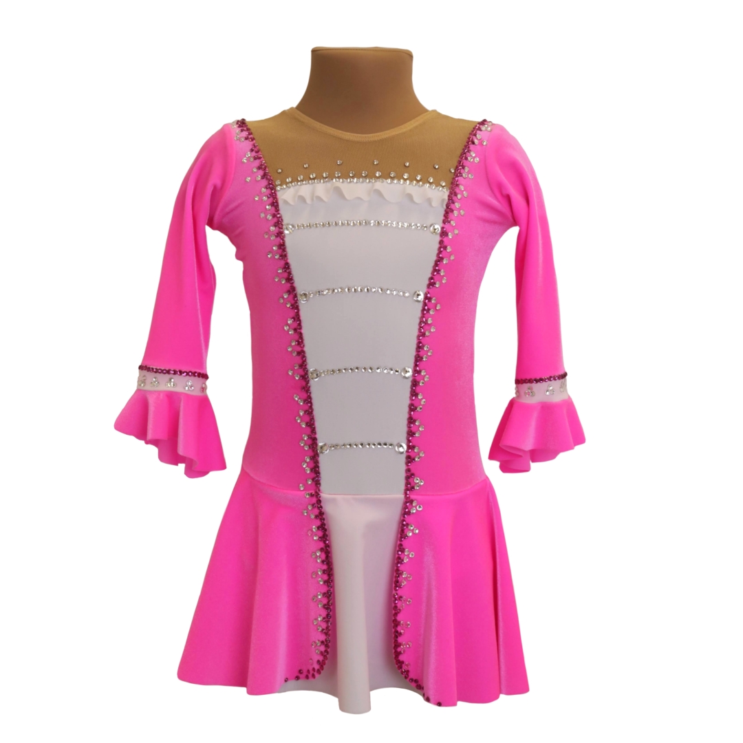 Diana kauniin pinkki luistelupuku tuo jäälle näyttävyyttä, leikkisyyttä ja säihkettä täydellinen valinta pienelle esiintyjälle, joka haluaa herättää huomiota niin tuomareissa kuin yleisössäkin. Puvun siluetti muistuttaa pikkutakkimaista esityspukua, jonka etuosaa koristavat aistarg crystal strassit ja keveä valkoinen röyhelökaulus.