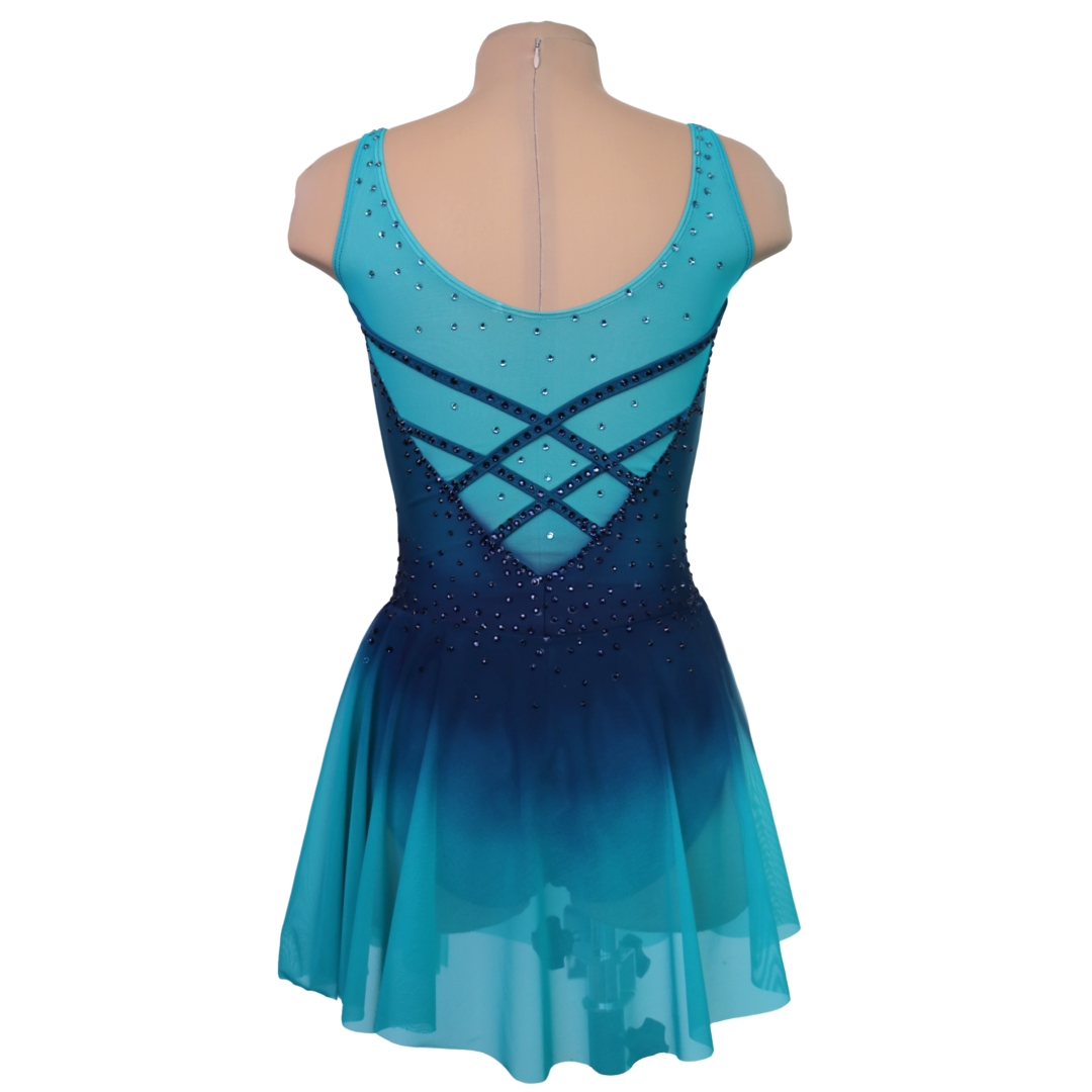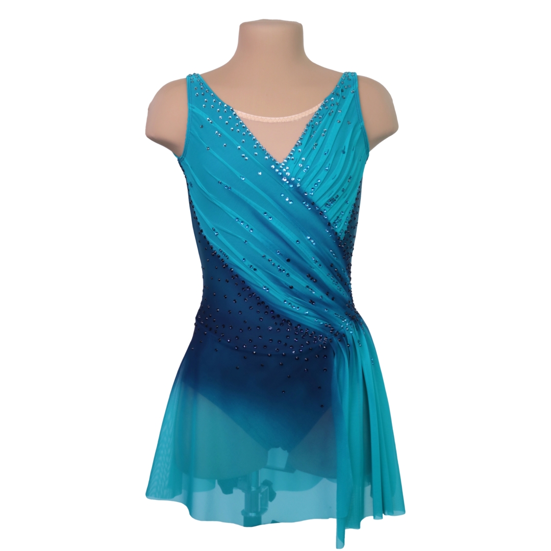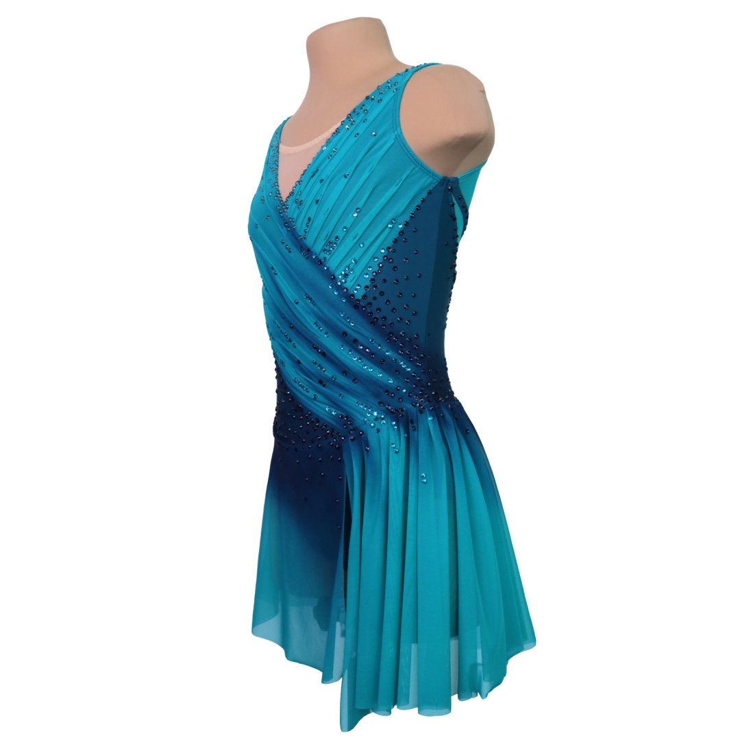Ines turkoosin ja yönsinisen harmoninen luistelupuku kietaisuleikkauksella
