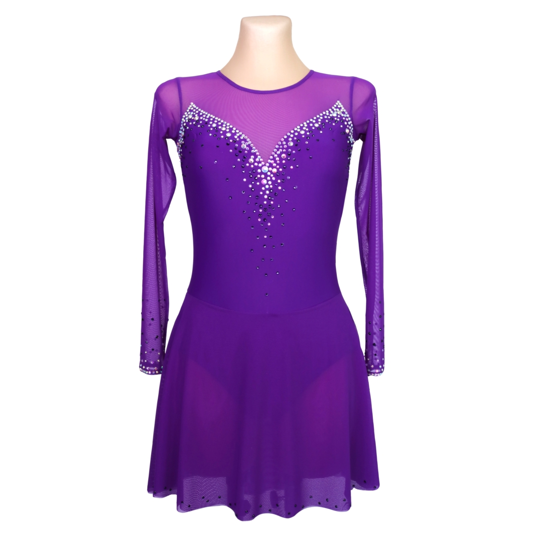 Tämä täyteläisen violetin sävyinen kisapuku on suunniteltu luistelijalle, joka arvostaa selkeyttä, ryhdikästä linjakkuutta ja hienostunutta säihkettä. Puvun verkkomateriaalista valmistettu yläosa ja hihat tuovat kokonaisuuteen keveyttä ja arvokkuutta, samalla kun ne tarjoavat kauniin kontrastin puvun sileälle päämateriaalille.